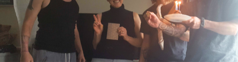I sat on the edge of the bed at Quest House (an amazing place started by an amazing man, where trans men care for trans men, after they are sent on their way from the hospital after gender affirming bottom surgery) in Marin County California, with my mom on the phone sounding nervous, as she told me the cancer spread to her liver. I cried softly. A few days later, my sweet friend along with another man in the house who recently had surgery, and his companion, sang me happy birthday as I sat in the living room recliner, praying I would make it home in time. (I didn’t ask them for permission to share their photo. If I get around to it and they agree, I’ll put their heads back on. But this will do for now.)
