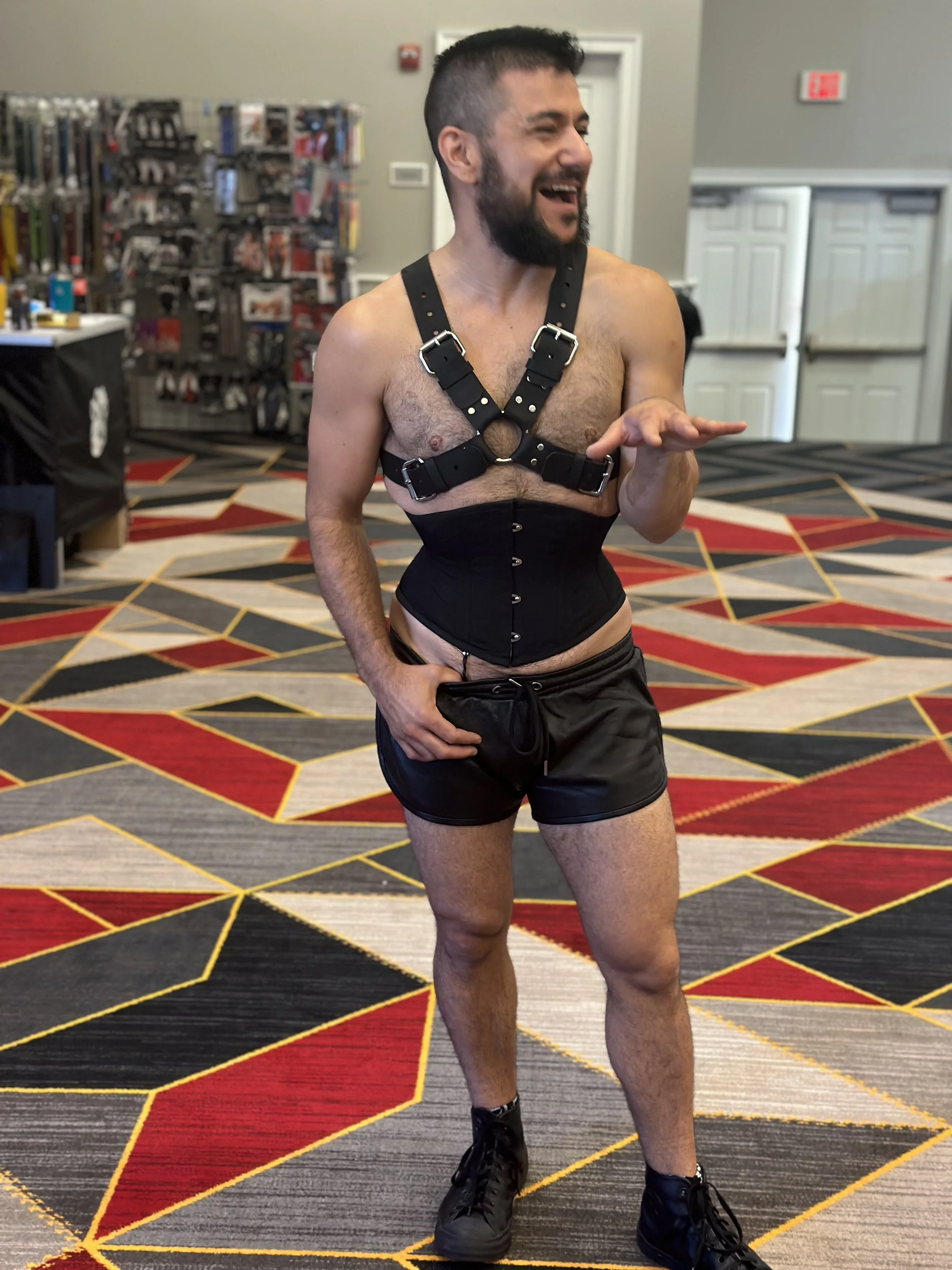 (The babes at Dark Garden Cortestry got me dressed up during some downtime while vending at a leather event, 2023)